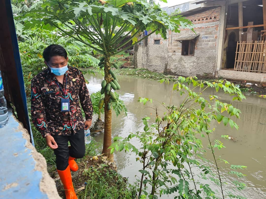 Lurah Bahagia Khoirul Anwar, S. STP, M.Si didampingi Ketua Bamuswa PUP Anwarudin meninjau titik lokasi banjir di PUP Sektor V, Kelurahan Bahagia, Kecamatan Babelan, Kabupaten Bekasi.