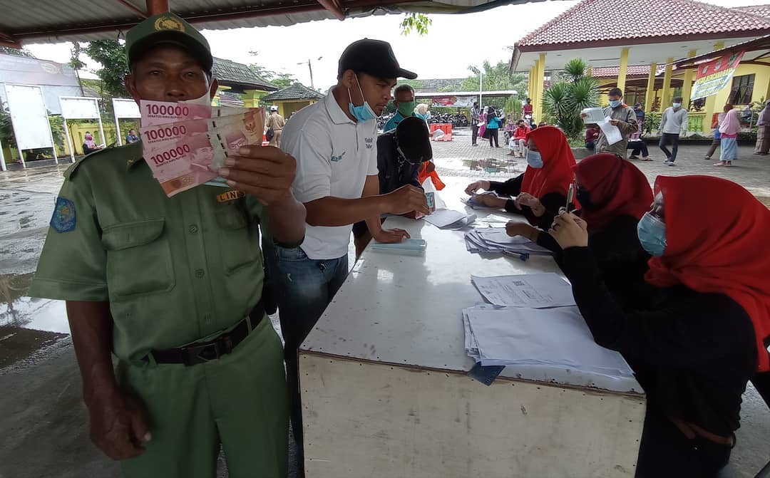 Sejumlah warga menerima Bantuan Sosial Tunai (BST) senilai Rp300 ribu, di Kelurahan Bahagia, Kecamatan Babelan, Kabupaten Bekasi.