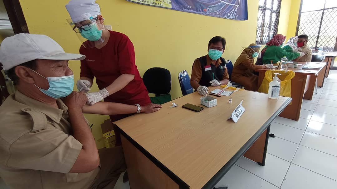 Vaksinasi COVID-19 Pelayan Publik yang terdiri dari Pegawai Kelurahan Bahagia dan Ketua RW se-Kelurahan Bahagia, Kecamatan Babelan, Kabupaten Bekasi.